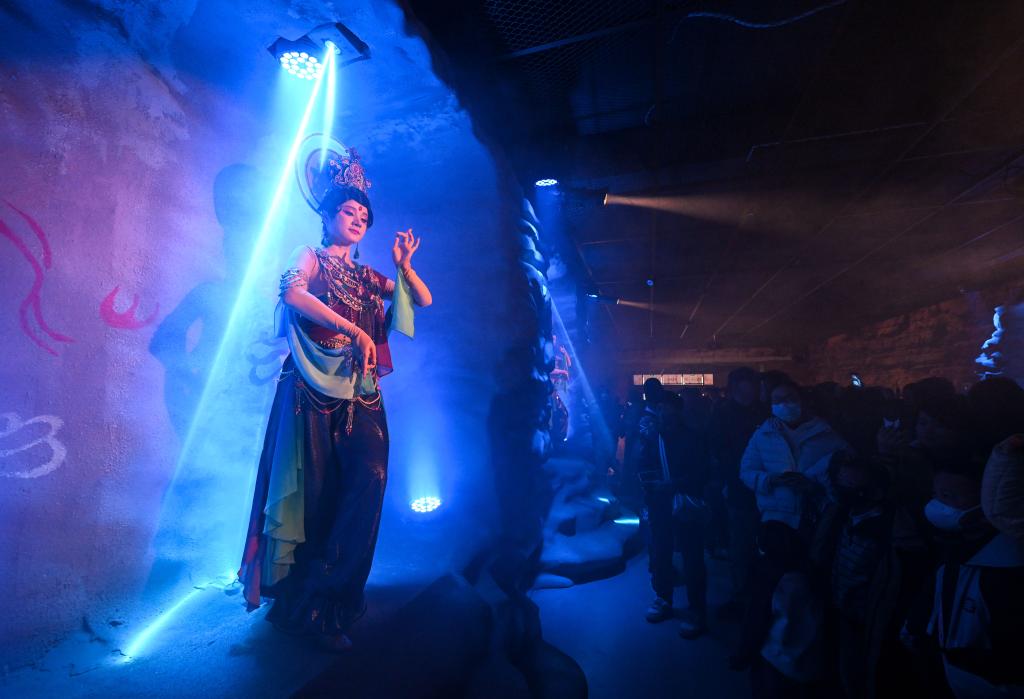 馬年春節(jié)期間,寧夏銀川市賀蘭山下格外熱鬧。走進(jìn)西夏陵博物館后數(shù)百米長(zhǎng)的廊道,游客仿佛穿越回千年前的西夏——身著各民族傳統(tǒng)服飾的“商賈”沿街叫賣(mài),“麻魁”女兵英姿颯爽,西夏壁畫(huà)中的“飛天”在神秘?zé)熿F與燈光中翩躚起舞……