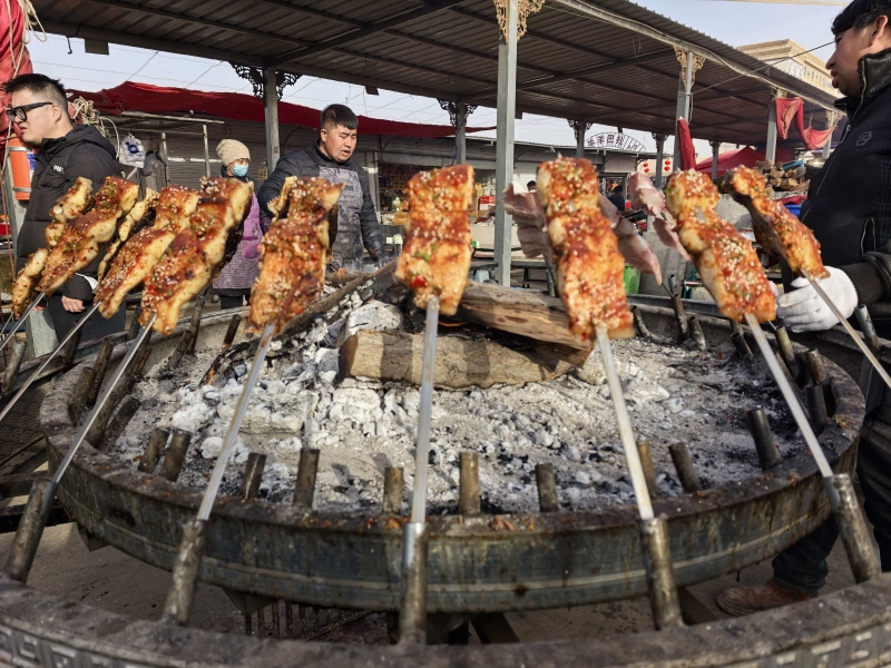 這是2月15日在喀什牛羊大巴扎上拍攝的售賣中的烤魚。新華社記者 蔡國棟 攝