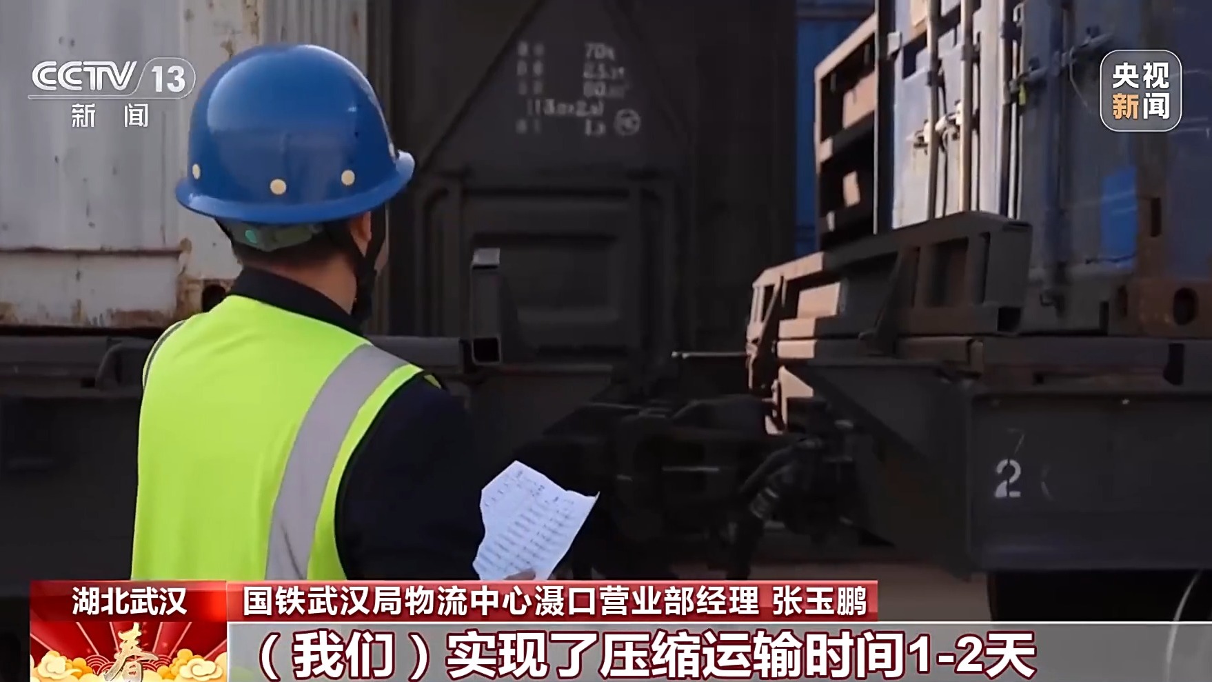 國鐵武漢局物流中心灄口營業(yè)部經(jīng)理 張玉鵬:現(xiàn)在貨量明顯上來了,很多企業(yè)開年第一批貨都集中在這幾天發(fā)運(yùn),每天發(fā)到3列左右。通過前置查驗(yàn)、集拼集運(yùn)、雙始發(fā)站聯(lián)動(dòng),我們實(shí)現(xiàn)了壓縮運(yùn)輸時(shí)間1-2天、降低物流成本15%。
