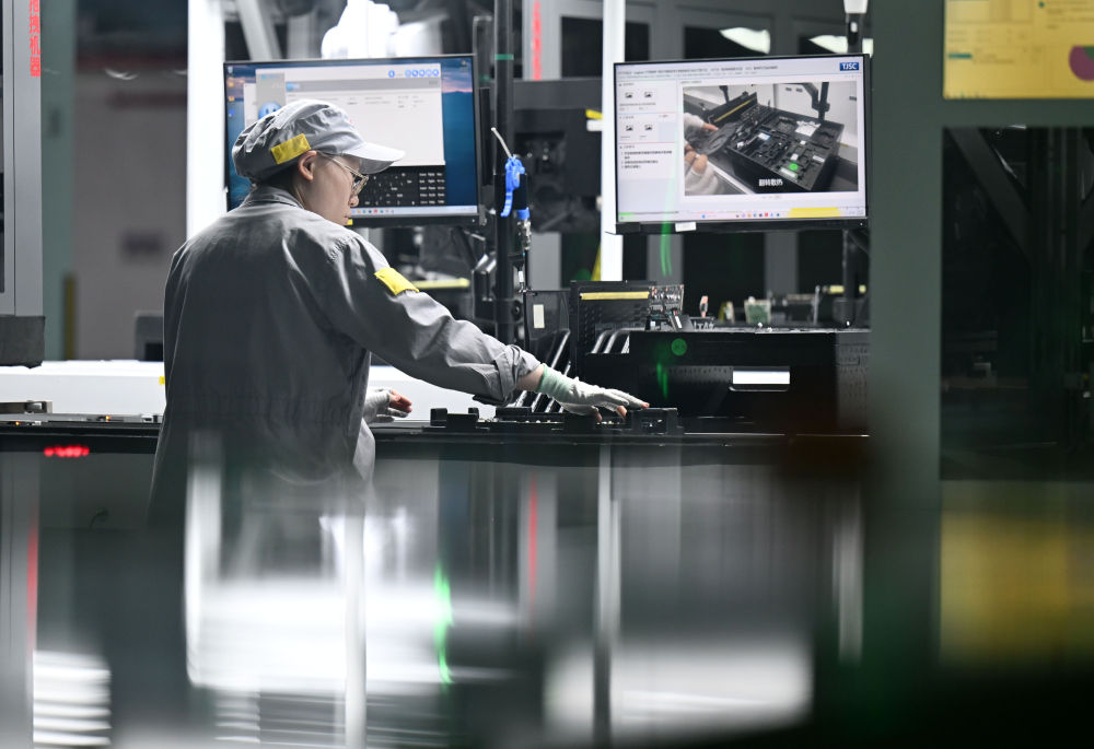 工作人員在聯(lián)想天津零碳智造工廠筆記本生產(chǎn)線進行作業(yè)。新華社記者趙子碩 攝