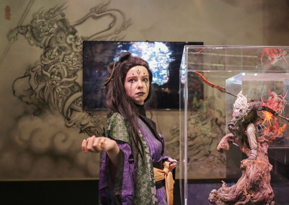 2025年8月20日,在德國科隆,一名《黑神話:悟空》游戲角色扮演者在游戲科學(xué)展臺(tái)與模型合影。