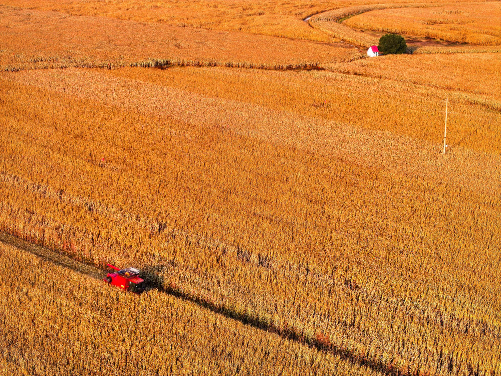 農(nóng)機(jī)手駕駛收割機(jī)在內(nèi)蒙古自治區(qū)通遼市科爾沁區(qū)豐田鎮(zhèn)收割玉米(2025年10月14日攝,無人機(jī)照片)。“十四五”時期,糧食總產(chǎn)量由2021年的1.37萬億斤增至2025年的1.43萬億斤,連續(xù)兩年站穩(wěn)在1.4萬億斤的臺階。