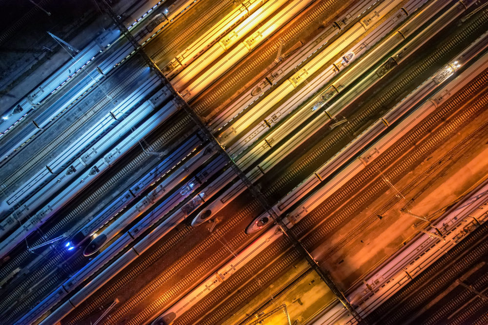 動車組列車??吭谫F陽北動車所內(nèi)(2023年1月6日攝,無人機(jī)照片)?!笆奈濉逼陂g,我國建成世界規(guī)模最大、先進(jìn)發(fā)達(dá)的高速鐵路網(wǎng)。