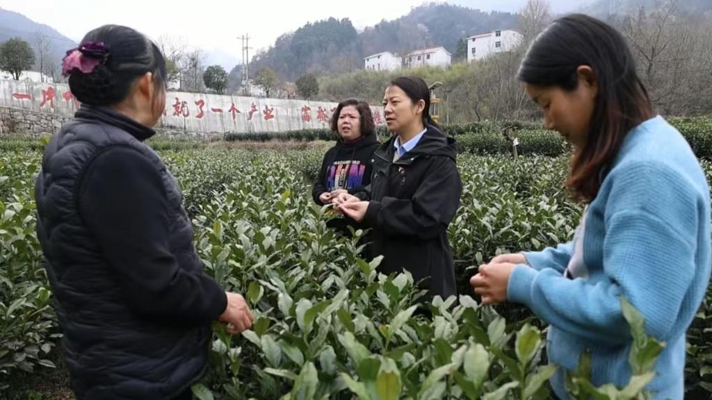 全國(guó)政協(xié)委員、安徽省金寨縣花石鄉(xiāng)大灣村黨總支第一書記余靜(右二)在茶園里和茶農(nóng)們交流。(受訪者供圖)