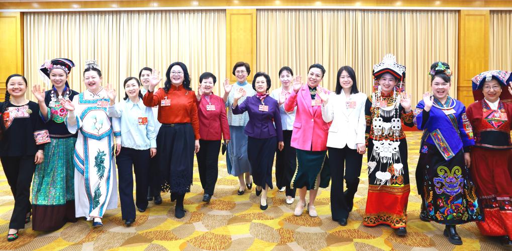 圖為貴州代表團(tuán)的女代表們?cè)谝黄?。(受訪者供圖)