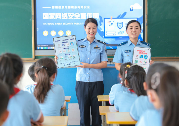 在山東省榮成市府新小學(xué)教室內(nèi),轄區(qū)民警通過(guò)案例講解為學(xué)生們普及網(wǎng)絡(luò)安全和防詐騙知識(shí)(2025年9月15日攝)。