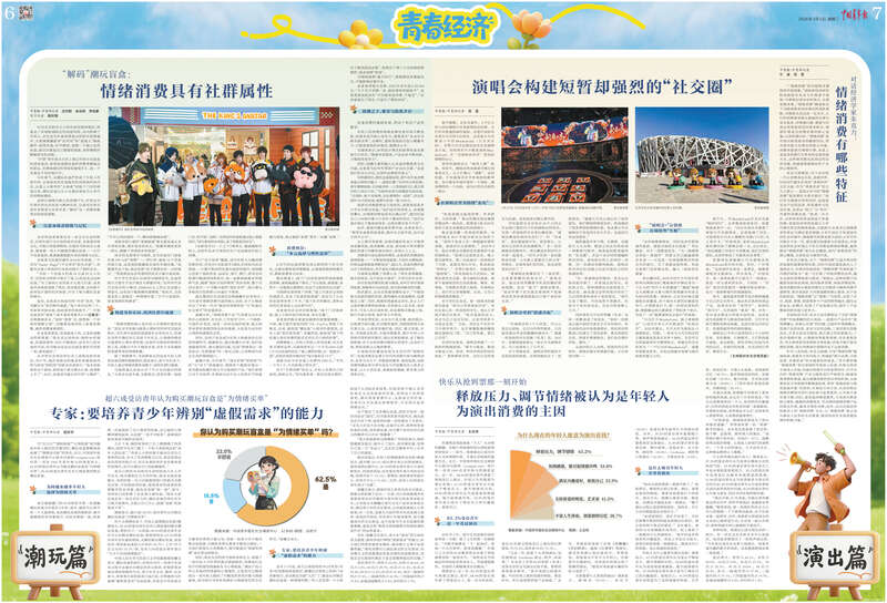 消費(fèi)端彰顯“青春經(jīng)濟(jì)”活力。青年消費(fèi)者追求的不再是單一產(chǎn)品,而是更加注重情感共鳴、文化認(rèn)同和價(jià)值表達(dá),由“性價(jià)比”轉(zhuǎn)向“心價(jià)比”。中青報(bào)及中青校媒記者調(diào)研發(fā)現(xiàn),61.2%的受訪青年會(huì)為了釋放壓力、調(diào)節(jié)情緒而為演出花錢,62.5%的受訪青年認(rèn)為購買潮玩盲盒是在為情緒買單。國研新經(jīng)濟(jì)研究院創(chuàng)始院長朱克力認(rèn)為,年輕一代的消費(fèi)正變得越來越多元化、個(gè)性化,充滿文化感、設(shè)計(jì)感和科技感?!斑@些特性與社會(huì)躍遷密切相關(guān)。”