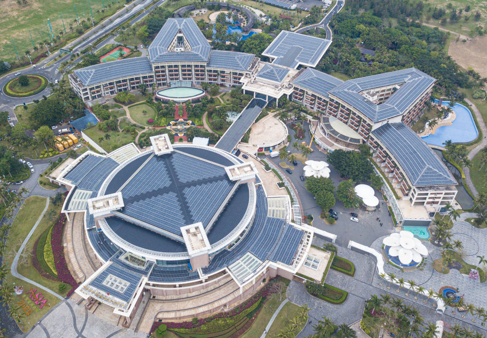 圖為博鰲亞洲論壇國際會議中心和博鰲亞洲論壇大酒店屋頂?shù)墓夥O(shè)備(2025年3月16日攝,無人機(jī)照片)。 新華社記者 蒲曉旭 攝
