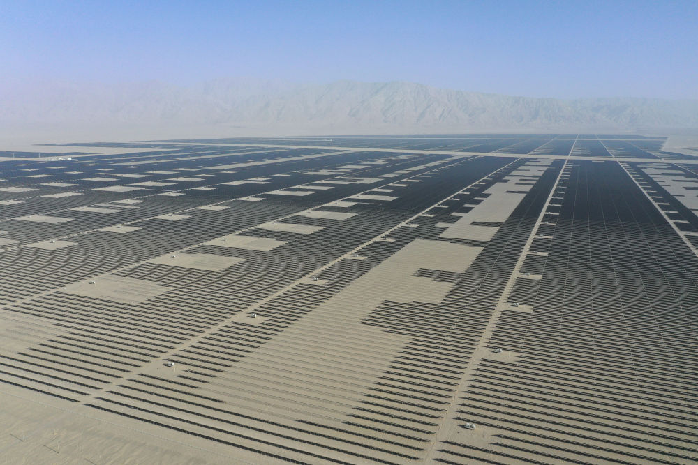 驅(qū)車行駛在巴音郭楞蒙古自治州若羌縣境內(nèi)的塔克拉瑪干沙漠邊緣,浩瀚沙海中,一片片深藍(lán)色光伏板如波浪般鋪展至天際。這里是一處400萬千瓦光伏項目現(xiàn)場。