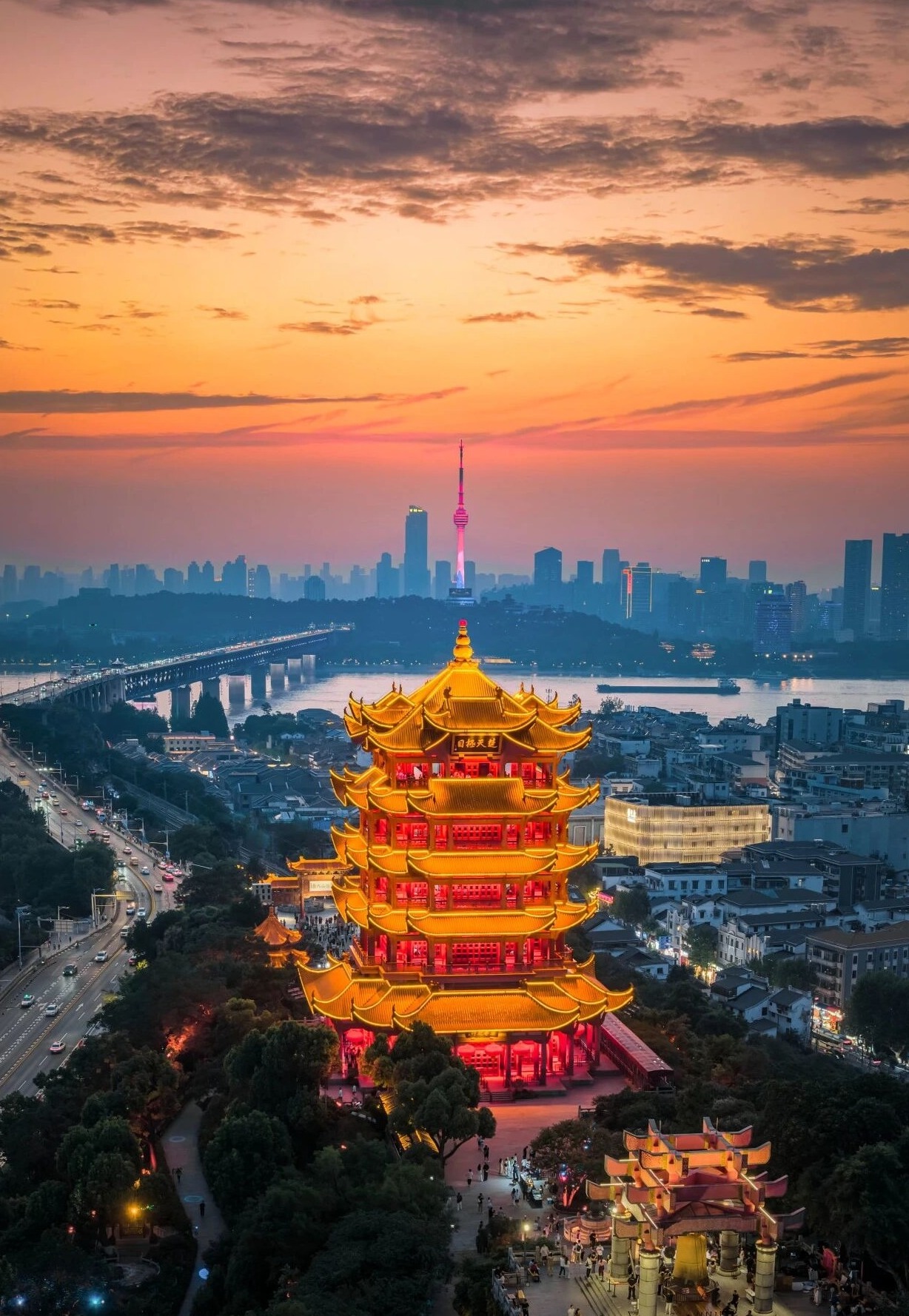 四百多年后,全國各地數(shù)萬名游客相聚于武漢龜山公園,在他們的鏡頭里,龜蛇兩山的新綠漫上山巔,長江大橋的鋼索牽著流云,黃鶴樓的飛檐挑著粉櫻。