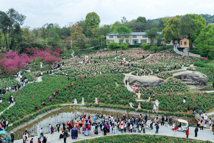 2026年3月22日,游客在重慶市巴南區(qū)二圣鎮(zhèn)集體村云林天鄉(xiāng)景區(qū)踏青游玩(無人機(jī)照片)。近年來,重慶市巴南區(qū)二圣鎮(zhèn)集體村依托云林天鄉(xiāng)景區(qū),發(fā)展都市休閑觀光農(nóng)業(yè),深入推進(jìn)農(nóng)文旅深度融合發(fā)展,通過打造油菜花、金魚草等不同品種的四季高山花海主題景區(qū),實(shí)現(xiàn)從過去苗木基地“賣苗木”到鄉(xiāng)村旅游“賣景觀”的轉(zhuǎn)變,帶動(dòng)村民增收致富。新華社記者 黃偉 攝