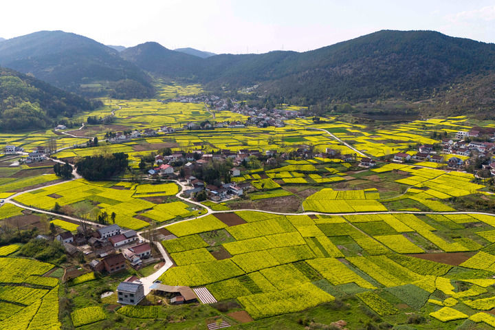 3月28日拍攝的漢中市南鄭區(qū)陽春鎮(zhèn)陳村的油菜花海(無人機(jī)照片)。新華社記者 鄒競一 攝