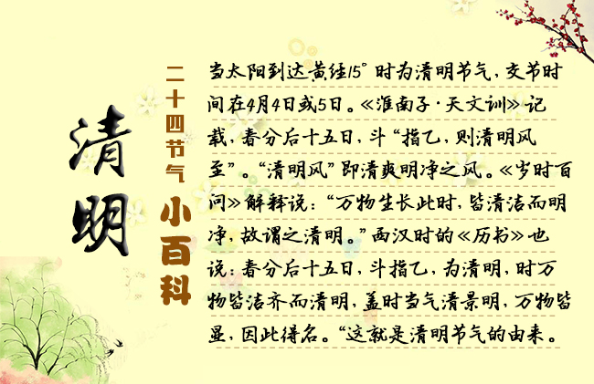節(jié)選自《二十四節(jié)氣志》/宋英杰 4月5日前后為清明節(jié)氣,氣清景明之意,正是鳥(niǎo)語(yǔ)花香的盛春時(shí)節(jié)。“言萬(wàn)物去故而從新,莫不鮮明之謂也?!薄叭f(wàn)物生長(zhǎng)此時(shí),皆清凈明潔,故謂之清明?!鼻迕髦?,便表征了這一時(shí)節(jié)的天氣是清新、明媚、和暖的。