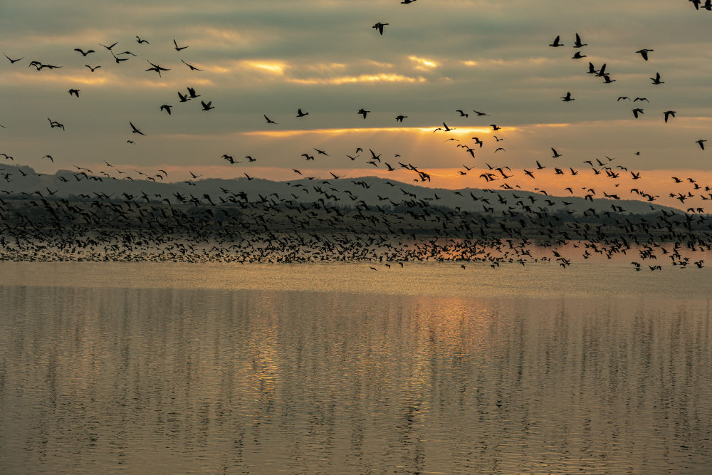 夕陽下,大雁群在吉林省琿春市敬信濕地翱翔。新華社發(fā)(郎鵬 攝)