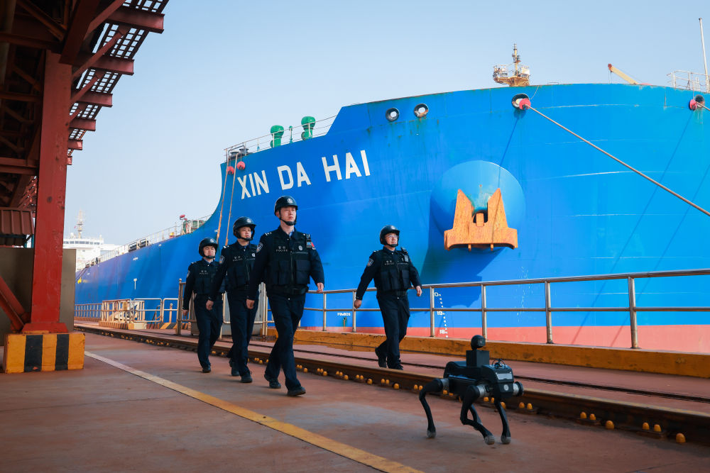 2026年4月2日,山東邊檢總站董家口邊檢站啟用四足機(jī)器人開展港區(qū)巡查,以科技強(qiáng)警提升管控效能。(受訪者供圖)