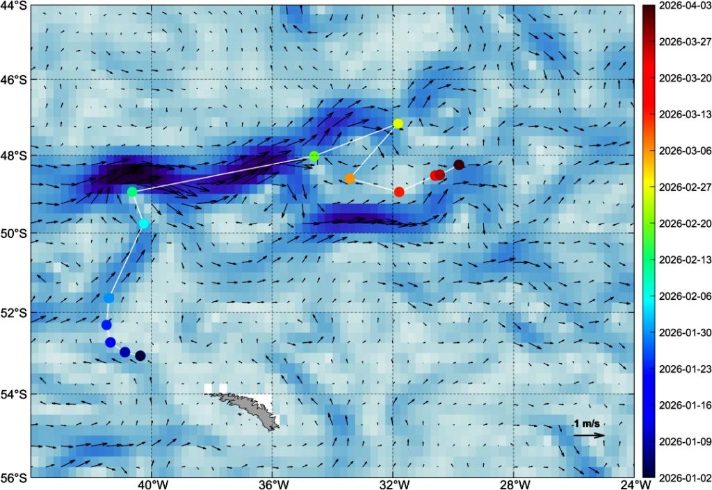 風云衛(wèi)星監(jiān)測的A23a冰山漂移路徑(圓點為冰山位置,時間與右側標注對應;圖底色和箭頭表示洋流)。(中國氣象局供圖)