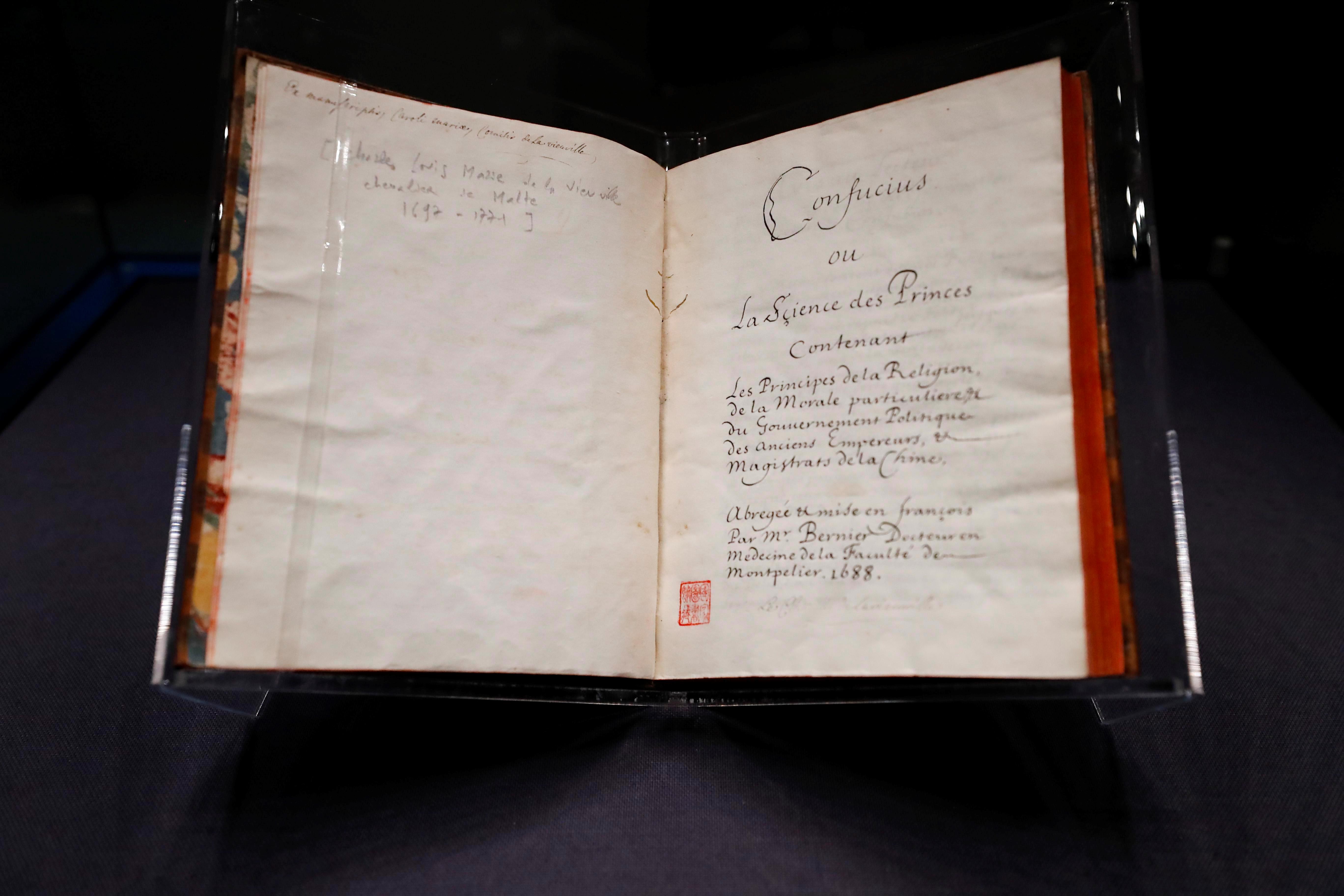 1688年,首部《論語導(dǎo)讀》法文版原著正式出版。牛皮封面、飄口燙金、染紋紙環(huán)襯、書口刷紅……這是一本富有法國啟蒙時期書籍裝幀特征的古老典籍,世界上僅存兩本。