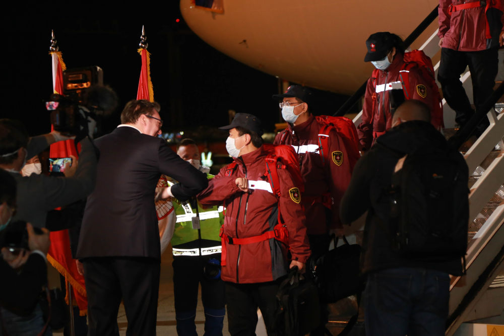 △2020年3月21日,在塞爾維亞貝爾格萊德,前來迎接的武契奇總統(tǒng)與中國援助塞爾維亞抗疫醫(yī)療專家組成員“碰肘”致意。