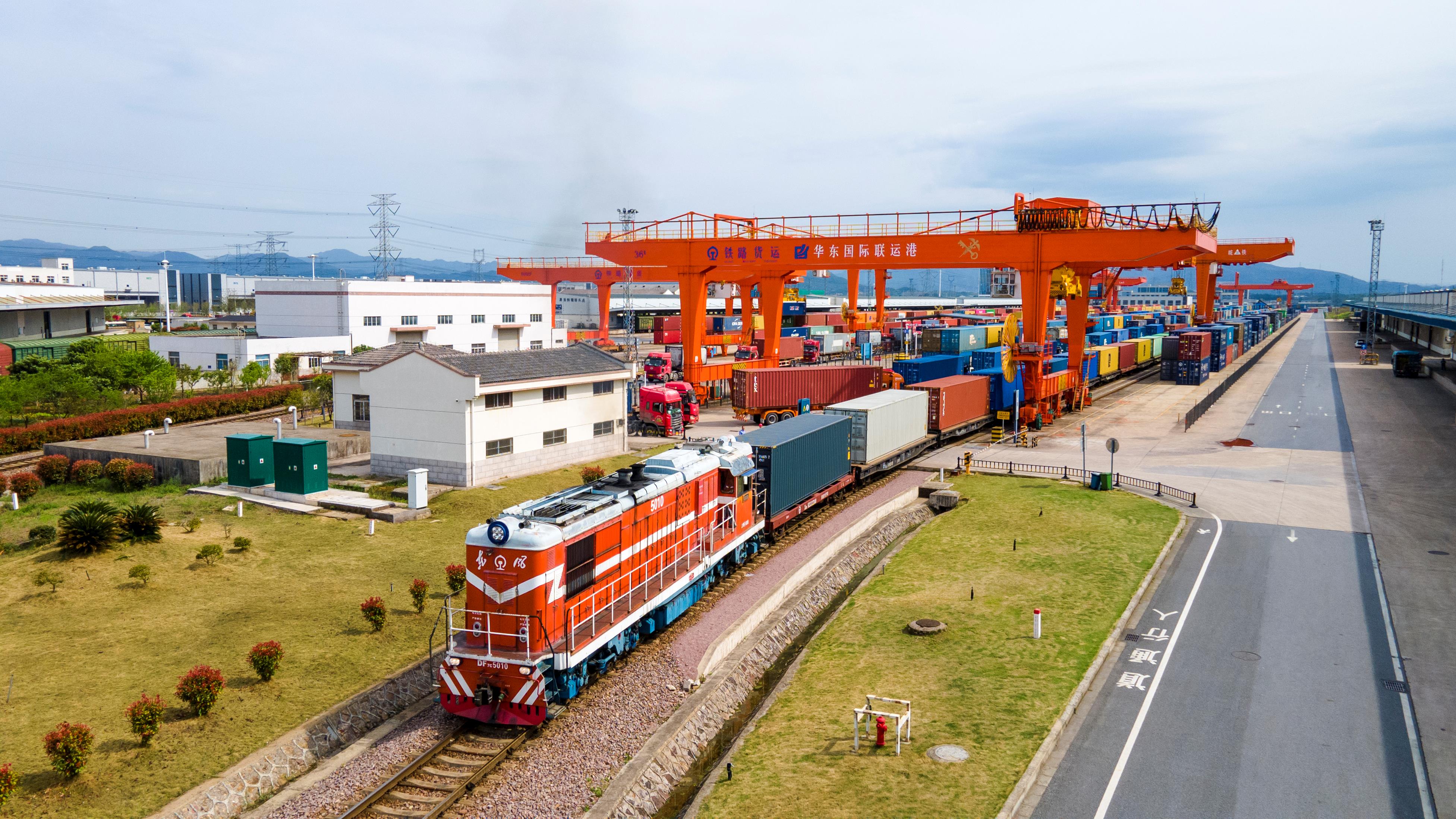 △2024年4月1日,浙江省金華華東國際聯(lián)運(yùn)港,一列中歐班列裝載110個標(biāo)箱日用百貨、電動工具、機(jī)械裝備等貨物從鐵路金華南貨場啟程駛往匈牙利布達(dá)佩斯。