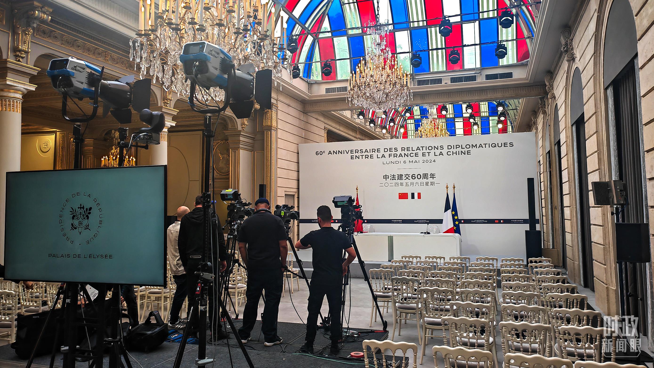 習(xí)主席在巴黎愛(ài)麗舍宮同馬克龍總統(tǒng)會(huì)談后共同會(huì)見(jiàn)記者,這是會(huì)見(jiàn)開(kāi)始前的現(xiàn)場(chǎng)。(總臺(tái)央視記者劉琦拍攝)