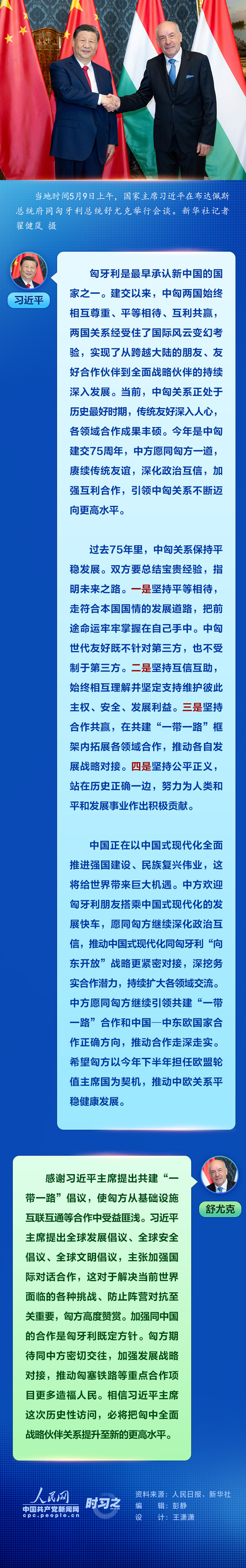 當?shù)貢r間5月9日上午,國家主席習近平在布達佩斯總統(tǒng)府同匈牙利總統(tǒng)舒尤克舉行會談。習近平指出,今年是中匈建交75周年,中方愿同匈方一道,賡續(xù)傳統(tǒng)友誼,深化政治互信,加強互利合作,引領(lǐng)中匈關(guān)系不斷邁向更高水平。