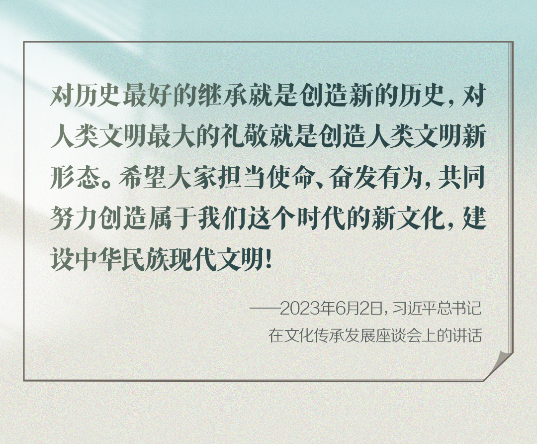 2023年6月2日,習(xí)近平總書記在文化傳承發(fā)展座談會(huì)上強(qiáng)調(diào):“在新的起點(diǎn)上繼續(xù)推動(dòng)文化繁榮、建設(shè)文化強(qiáng)國、建設(shè)中華民族現(xiàn)代文明,是我們?cè)谛聲r(shí)代新的文化使命?!?/p>