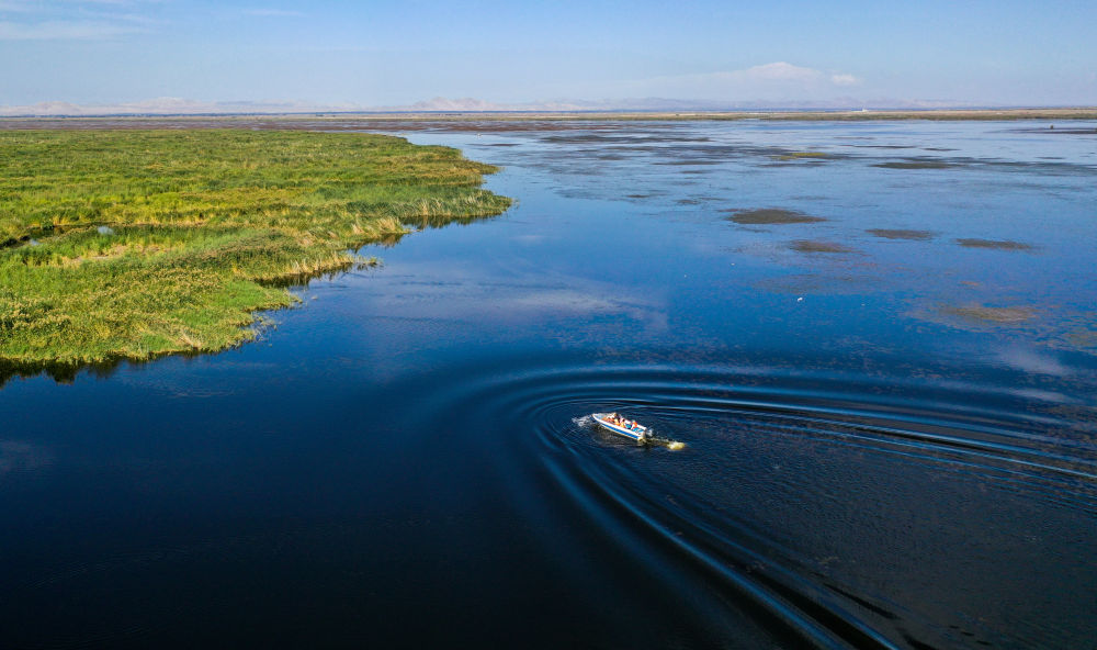 2023年9月15日,河湖濕地水環(huán)境保護與修復技術研究團隊在內(nèi)蒙古烏梁素海采集湖水樣本(無人機照片)。位于黃河“幾字彎”頂部的烏梁素海,是黃河流域最大的湖泊濕地,是控制京津風沙源的天然生態(tài)屏障。近年來,當?shù)夭粩嗉訌姙趿核睾>C合治理力度,生態(tài)環(huán)境持續(xù)好轉(zhuǎn)。