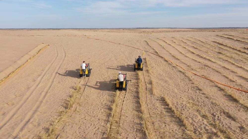 “過去我們不知道什么樣的機械適合在沙漠腹地運行,扎草方格和種苗一直依靠人工,效率很低?!倍庞儡娬f,烏拉特后旗沙化土地面積2065萬余畝,已經(jīng)治理的面積僅有459萬余畝,剩余治理任務重、難度大,很多地方連路都沒有,光靠人工背著草和樹進去,耗時太長,“‘人海戰(zhàn)術(shù)’已經(jīng)難以滿足新時代防沙治沙需求”。