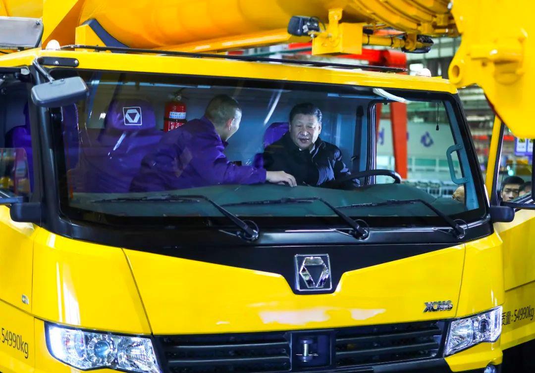 2017年12月12日,習(xí)近平總書記在江蘇徐州徐工集團坐進剛下線的XCA220型全地面起重機駕駛室,向技術(shù)人員詳細詢問起重機的性能、產(chǎn)量、價格等。