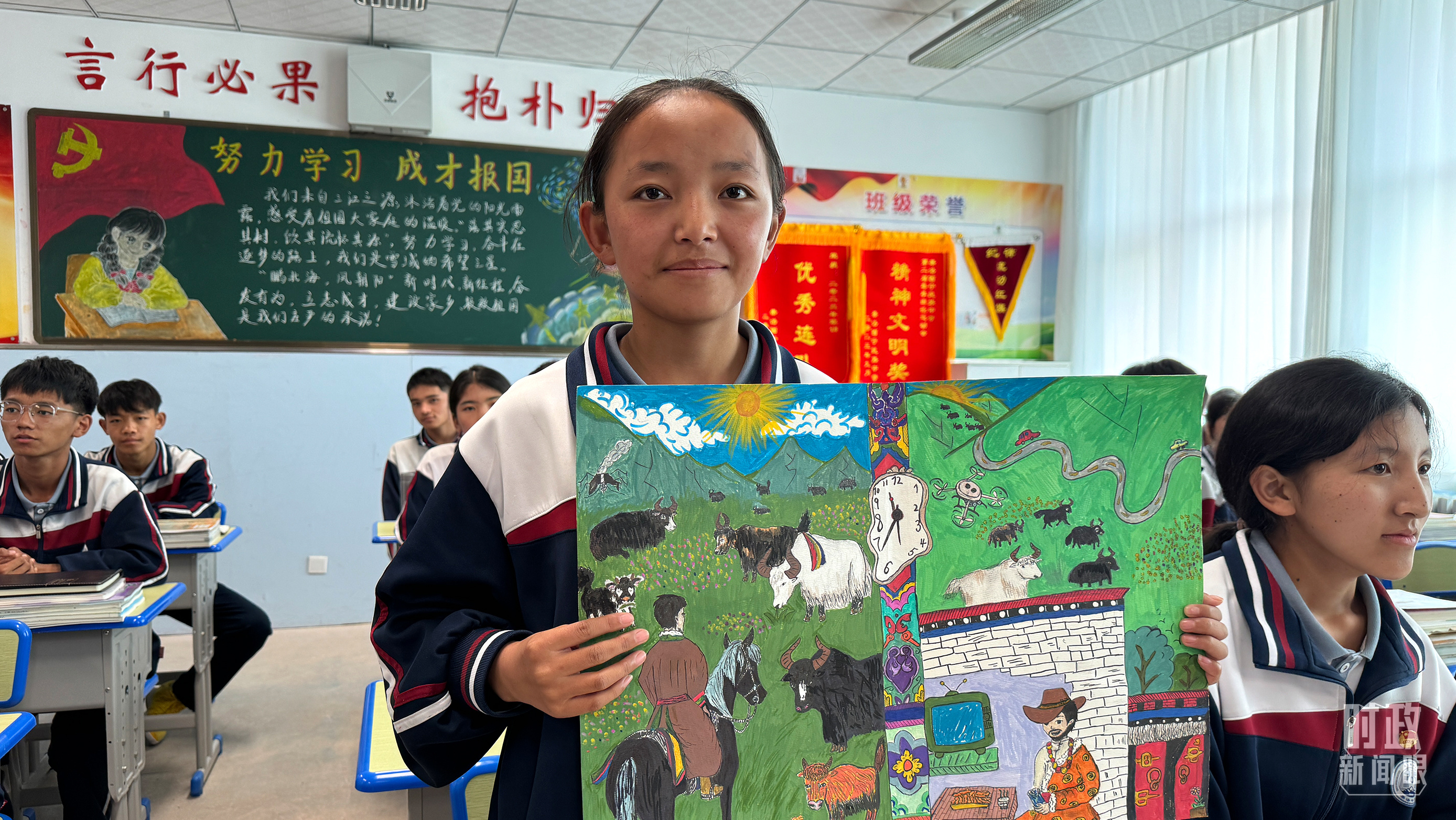 果洛西寧民族中學(xué)高一(1)班的“新時代、新家鄉(xiāng)”主題思政課。(總臺央視記者許永松、國廣記者李晉拍攝)