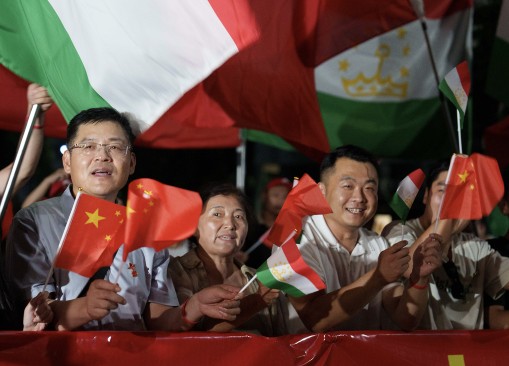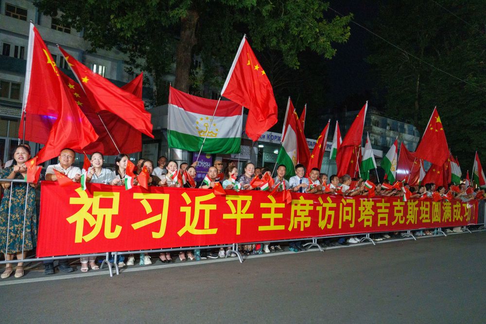 習(xí)近平乘車從機場赴下榻飯店途中,中塔兩國國旗迎風(fēng)飄揚,當(dāng)?shù)厝A僑華人和中資機構(gòu)代表列隊揮舞中塔兩國國旗,熱烈歡迎習(xí)近平訪問塔吉克斯坦。