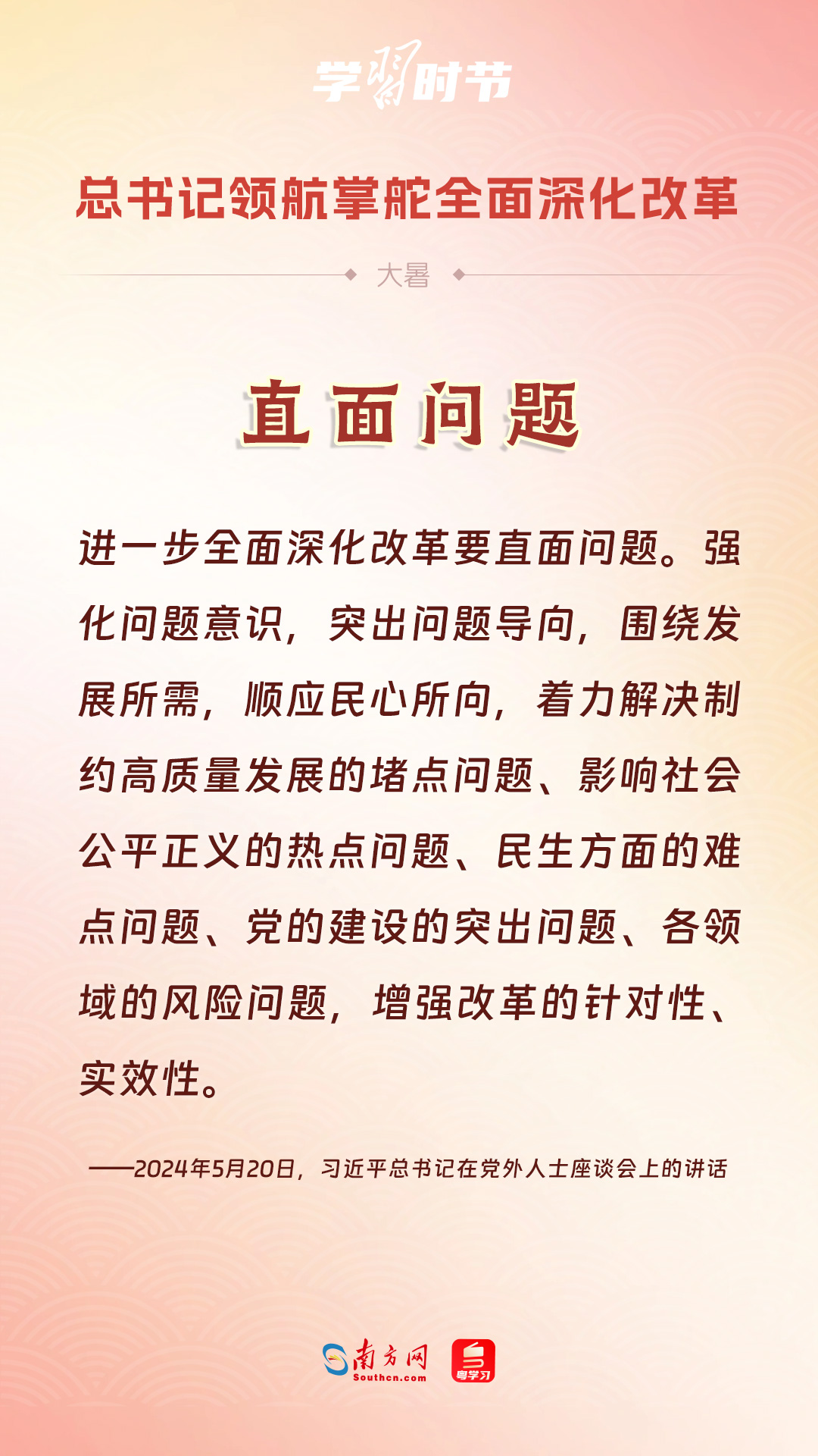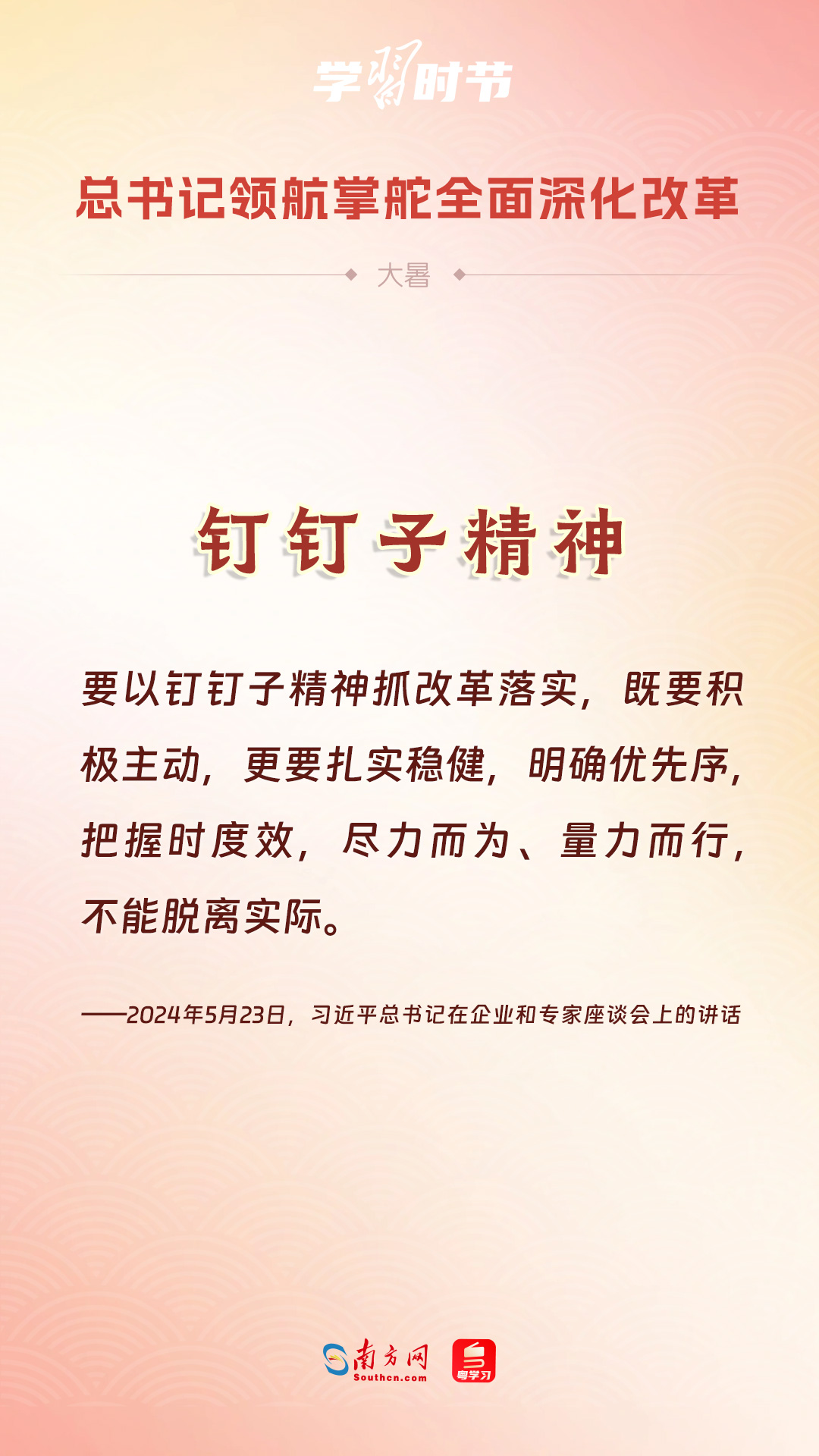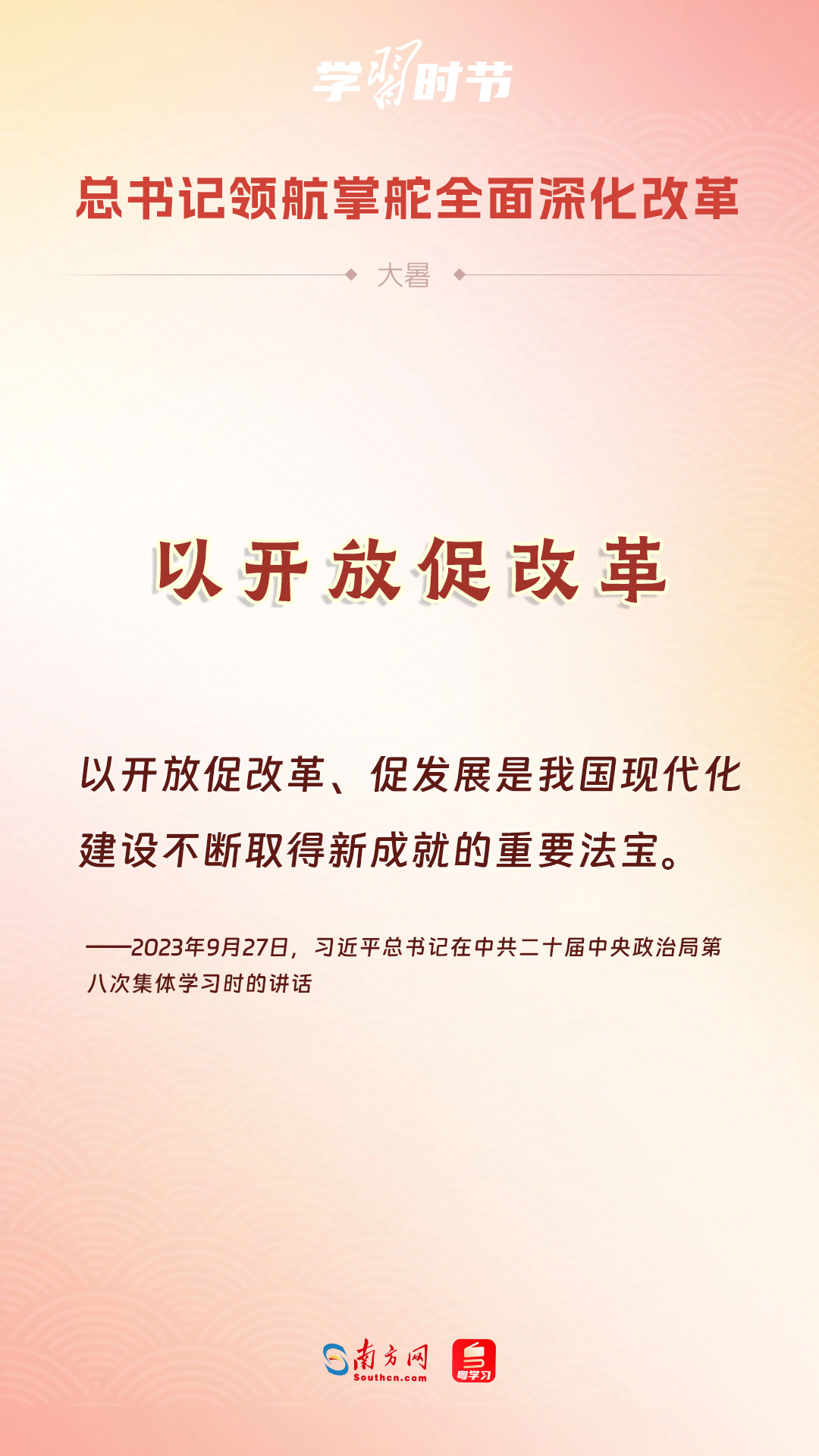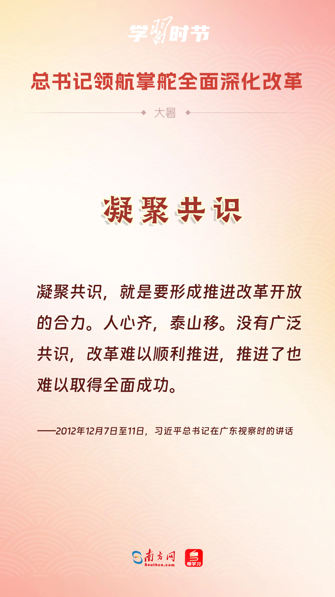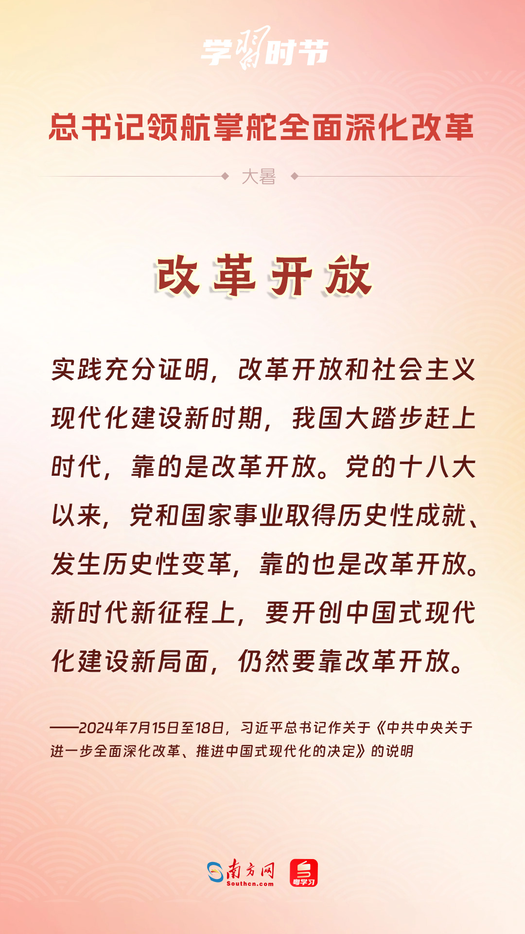 黨的十八大以來,習(xí)近平總書記親自領(lǐng)導(dǎo)、親自部署、親自推動(dòng)全面深化改革工作,推動(dòng)全面深化改革事業(yè)在攻堅(jiān)克難中不斷邁上新臺(tái)階、取得新勝利。在驕陽似火的大暑時(shí)節(jié),通過一組海報(bào),讓我們共同學(xué)習(xí)習(xí)近平總書記關(guān)于“全面深化改革”的重要論述。