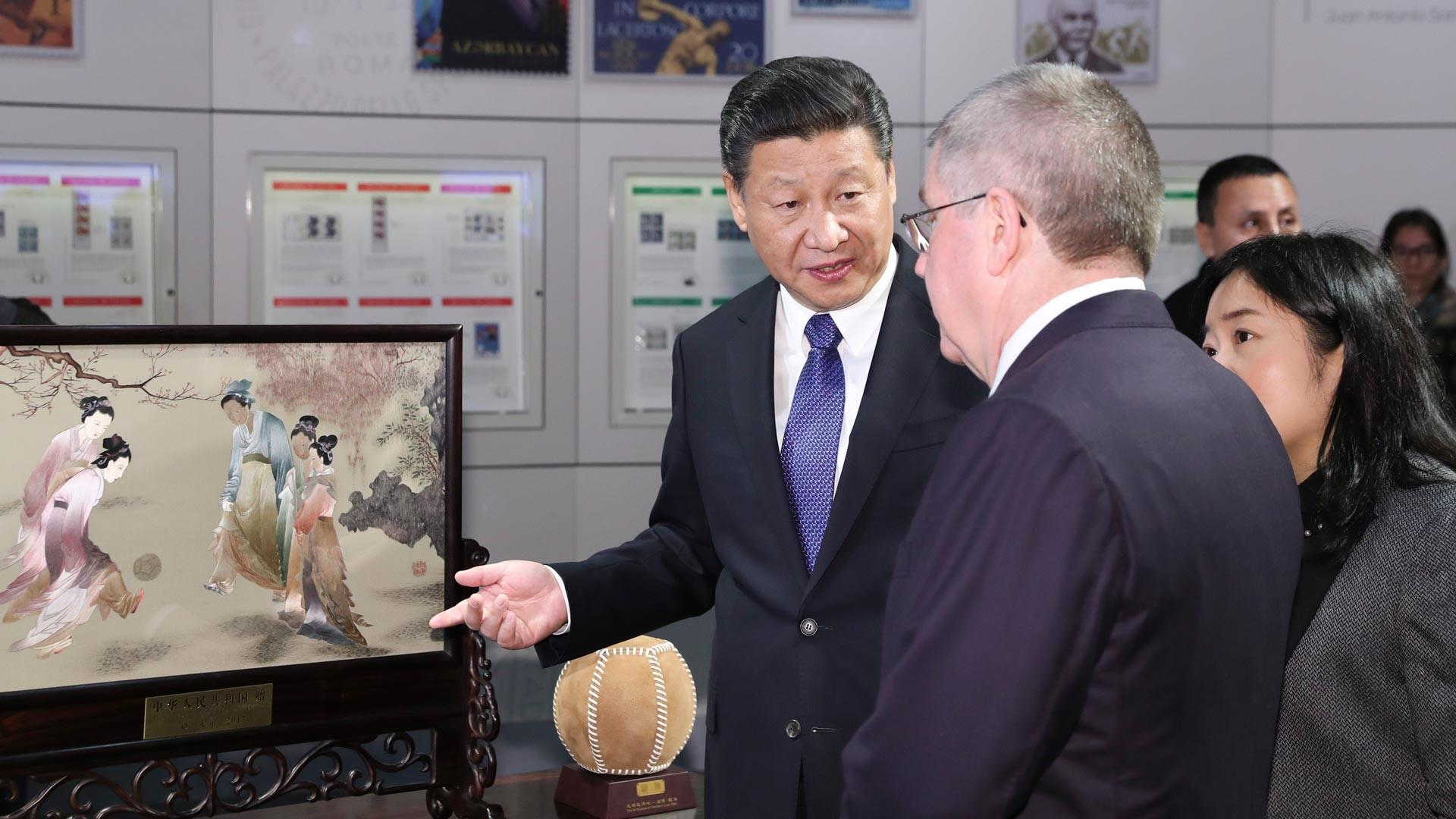 2017年1月,習(xí)近平主席在訪問瑞士期間專程來到坐落在洛桑半山腰的國際奧林匹克博物館。這是中國國家元首首次到訪。習(xí)近平主席代表中國向國際奧委會贈送了蘇繡《仕女蹴鞠圖》,并在留言簿上用中文寫下:“弘揚奧運精神,促進(jìn)和平發(fā)展”。