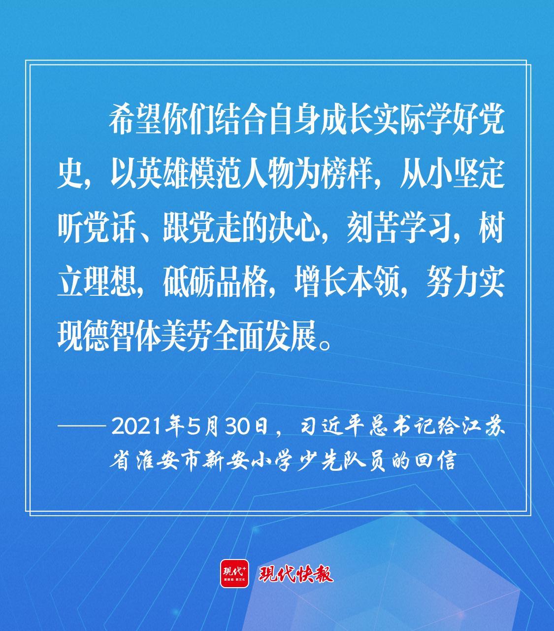 2021年5月30日,習(xí)近平總書記給江蘇省淮安市新安小學(xué)少先隊員回信時強(qiáng)調(diào),“希望你們結(jié)合自身成長實(shí)際學(xué)好黨史,以英雄模范人物為榜樣,從小堅定聽黨話、跟黨走的決心,刻苦學(xué)習(xí),樹立理想,砥礪品格,增長本領(lǐng),努力實(shí)現(xiàn)德智體美勞全面發(fā)展。”