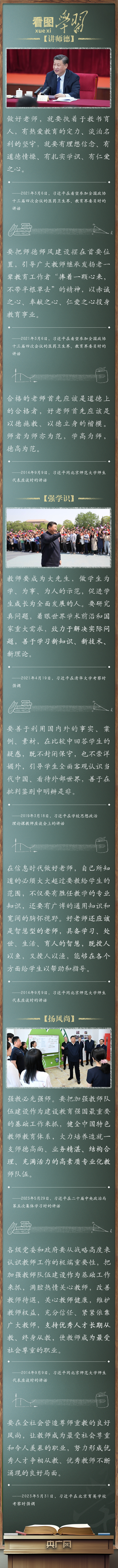 教育大計(jì),教師為本。黨的十八大以來,以習(xí)近平同志為核心的黨中央堅(jiān)持把教育擺在優(yōu)先發(fā)展的戰(zhàn)略位置,推動(dòng)新時(shí)代教育事業(yè)取得歷史性成就、發(fā)生格局性變化。習(xí)近平總書記緊扣“培養(yǎng)什么人、怎樣培養(yǎng)人、為誰培養(yǎng)人”這一教育的根本問題,對(duì)建設(shè)新時(shí)代高素質(zhì)專業(yè)化教師隊(duì)伍作出一系列重要指示,激勵(lì)廣大教師立德修身、敬業(yè)立學(xué),強(qiáng)調(diào)要在全黨全社會(huì)弘揚(yáng)尊師重教的社會(huì)風(fēng)尚。在第四十個(gè)教師節(jié)到來之際,讓我們一起牢記并踐行總書記的殷殷囑托!