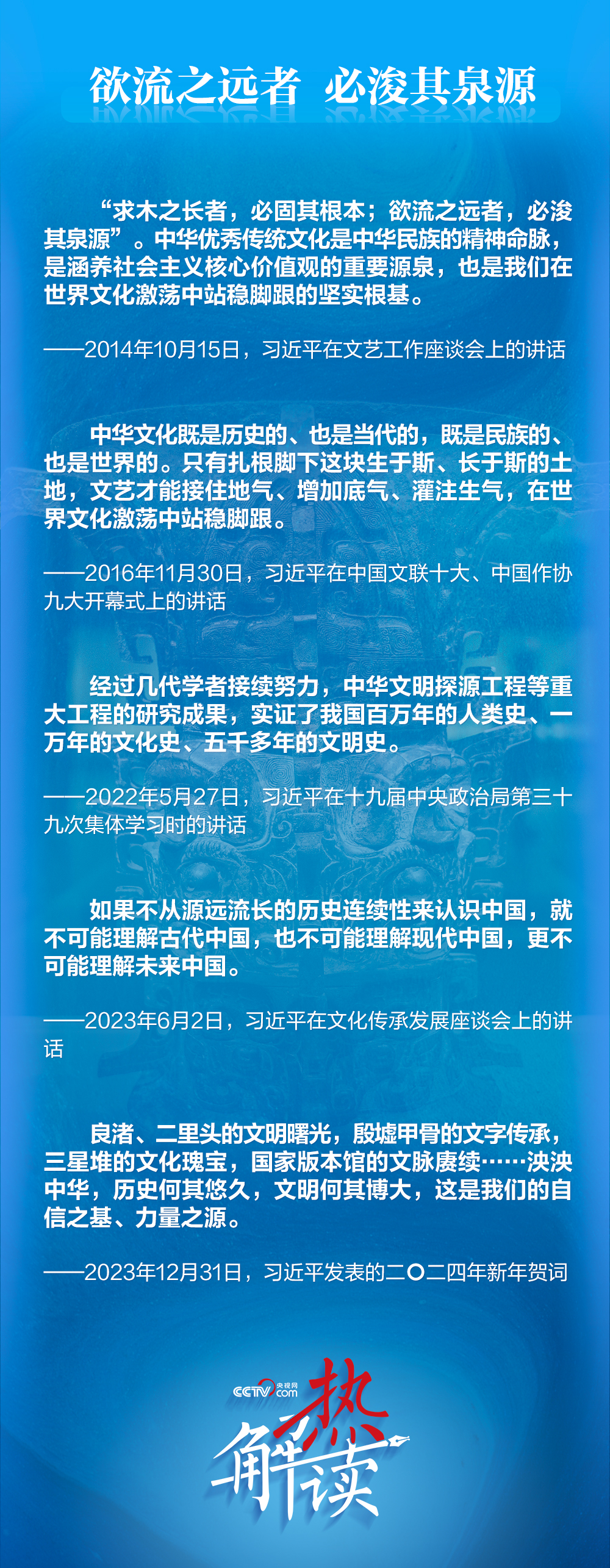 一件件文物、一處處文化古跡、一項項文化藝術(shù),串連起中華民族的文化史,蘊藏著“何以中國”的文化力量??倳泴χ腥A文明之源的關(guān)注,彰顯的正是他對推動文化繁榮、建設文化強國的深刻思考和文化自信。