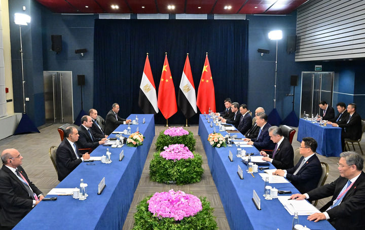 習(xí)近平祝賀并歡迎埃及首次作為正式成員參加金磚國(guó)家領(lǐng)導(dǎo)人會(huì)晤。習(xí)近平指出,今年是“中?;锇槟辍焙蛢蓢?guó)建立全面戰(zhàn)略伙伴關(guān)系10周年。中方堅(jiān)定支持埃及維護(hù)國(guó)家主權(quán)、安全、發(fā)展利益,愿同埃方做守望相助的真誠(chéng)朋友、攜手發(fā)展的親密伙伴。雙方要繼續(xù)堅(jiān)定相互支持,鞏固政治互信,深化務(wù)實(shí)合作,高質(zhì)量共建“一帶一路”,密切人文交流,推動(dòng)雙邊關(guān)系朝著構(gòu)建面向新時(shí)代的中埃命運(yùn)共同體目標(biāo)持續(xù)邁進(jìn)。中方也愿同埃方加強(qiáng)協(xié)調(diào),推動(dòng)“大金磚合作”行穩(wěn)致遠(yuǎn),進(jìn)一步提升全球南方影響力和發(fā)言權(quán),維護(hù)發(fā)展中國(guó)家共同利益。