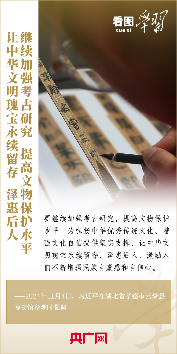 11月4日,習(xí)近平總書記在湖北省孝感市云夢縣博物館參觀出土秦漢簡牘展。這里收藏的我國考古史上首次發(fā)現(xiàn)的秦簡——云夢睡虎地秦簡,反映了戰(zhàn)國晚期到秦始皇時期的政治、經(jīng)濟、文化、法律、軍事等方面的情況。習(xí)總書記詳細聽取簡牘內(nèi)容、歷史文化價值和保護研究情況介紹,指出要繼續(xù)加強考古研究,提高文物保護水平,讓中華文明瑰寶永續(xù)留存、澤惠后人。