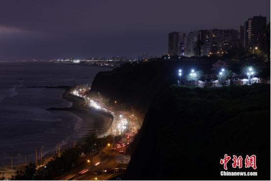 當(dāng)?shù)貢r間11月12日,秘魯首都利馬的海邊夜景。中新社記者 盛佳鵬 攝