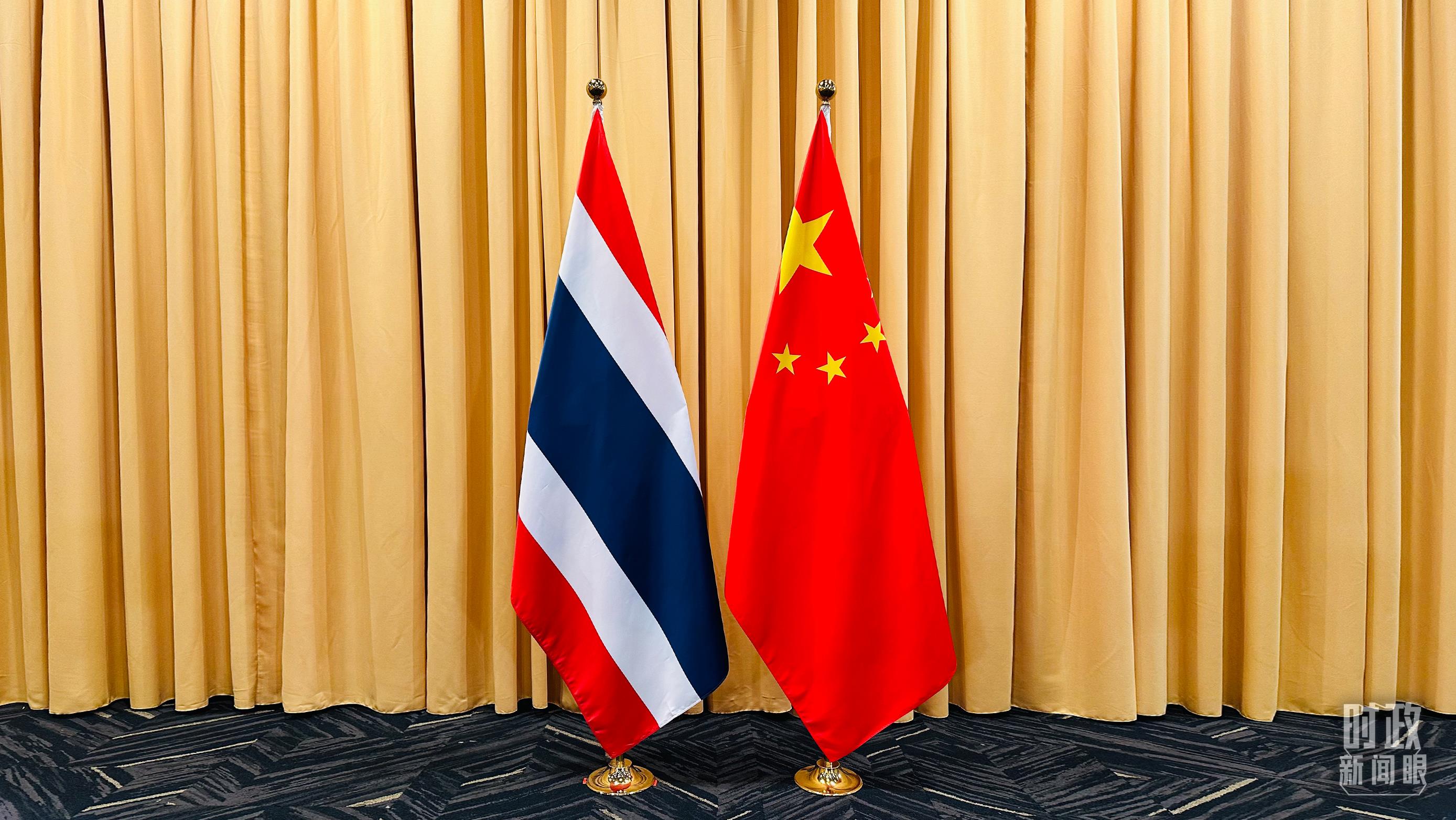 會(huì)見現(xiàn)場(chǎng)的中泰兩國(guó)國(guó)旗。(總臺(tái)央視記者范一鳴拍攝)