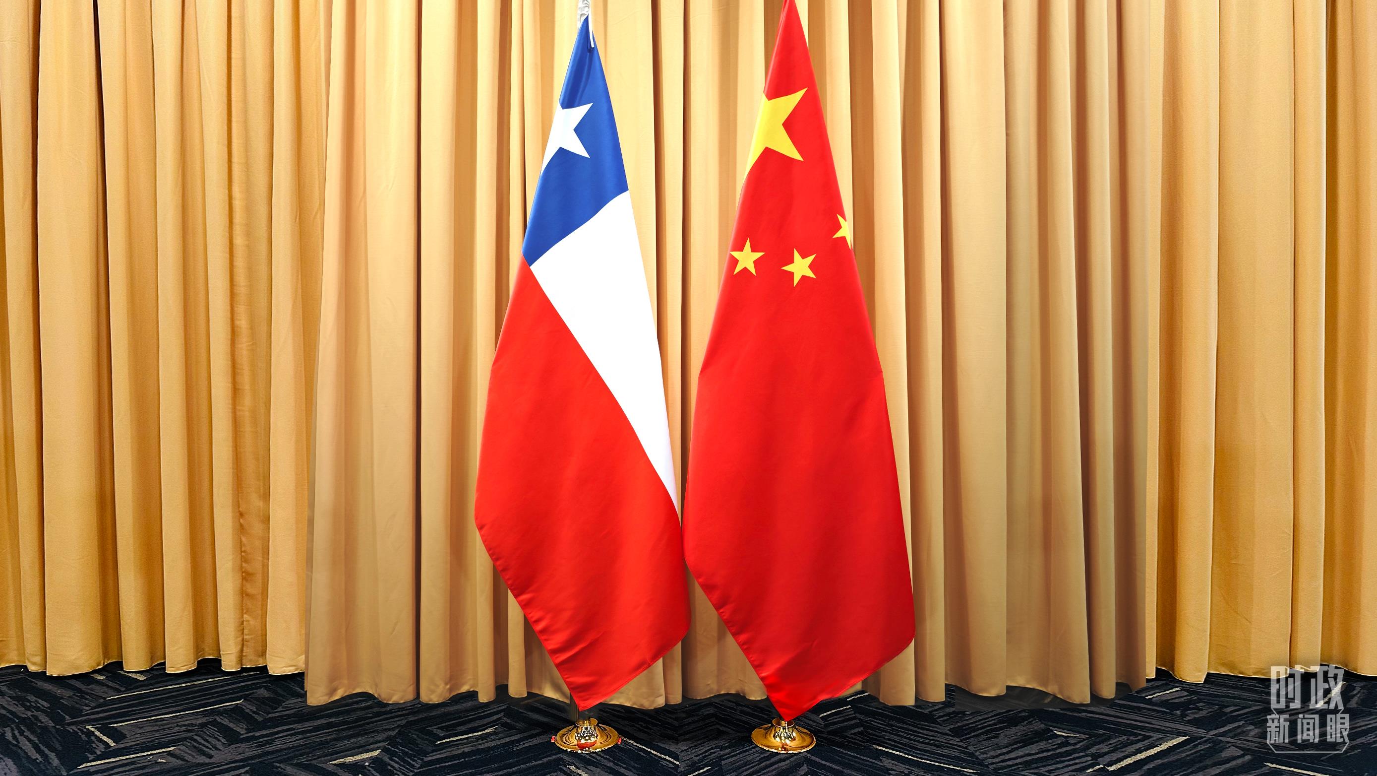 會(huì)見現(xiàn)場(chǎng)的中智兩國(guó)國(guó)旗。(總臺(tái)央視記者耿小龍拍攝)