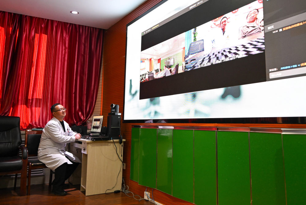 2024年12月17日,在青海省海南藏族自治州共和縣中醫(yī)院,醫(yī)生與鄉(xiāng)鎮(zhèn)衛(wèi)生院連線進(jìn)行遠(yuǎn)程會(huì)診。