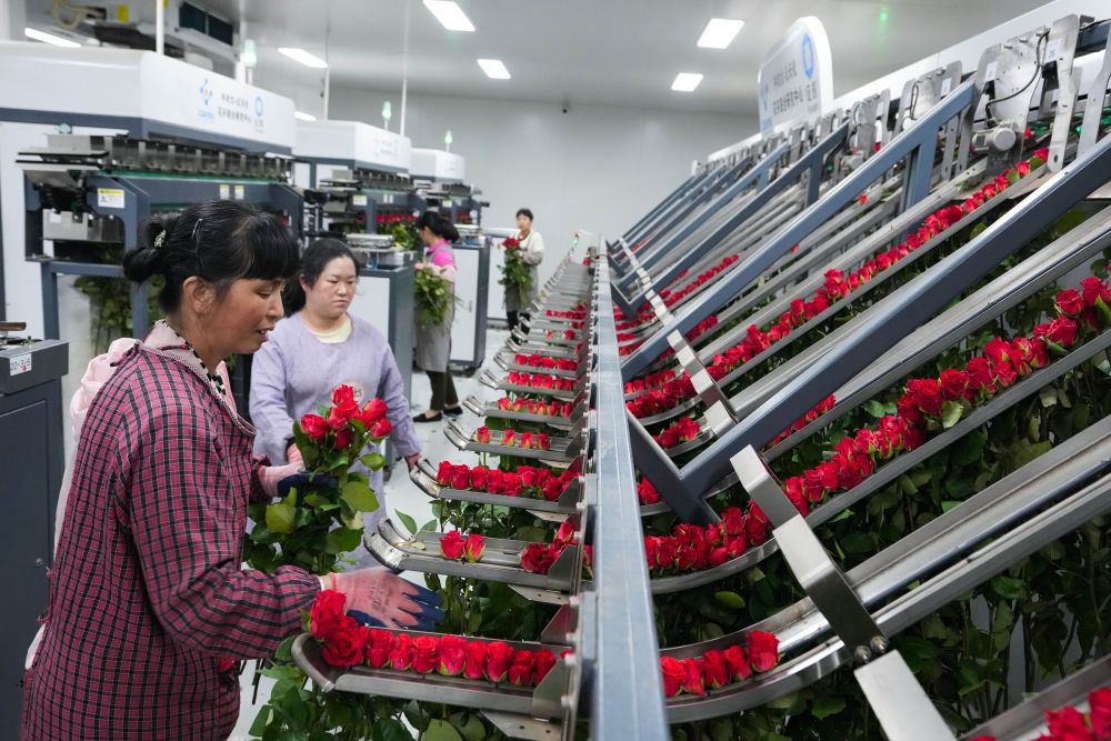 2024年8月23日,在云南晉寧花卉產業(yè)現(xiàn)代化示范園采后處理中心,花農將鮮切花自動分揀流水線上分揀好的鮮花取下,準備放入包裝流水線。