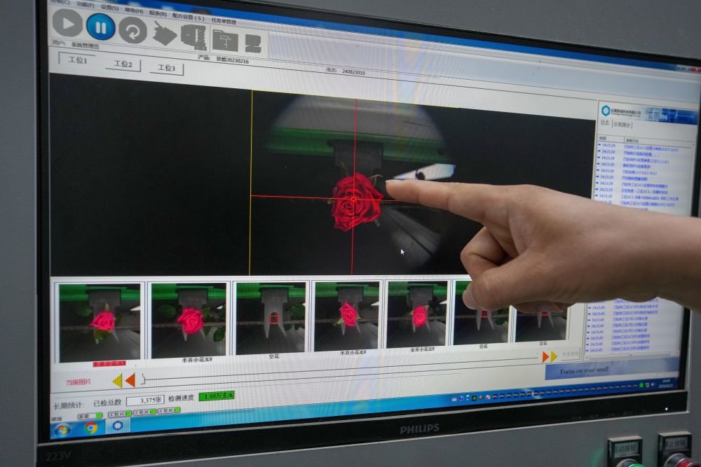 2024年8月23日,在云南晉寧花卉產業(yè)現(xiàn)代化示范園采后處理中心,計算機在實時監(jiān)測自動分揀流水線上的鮮切花。