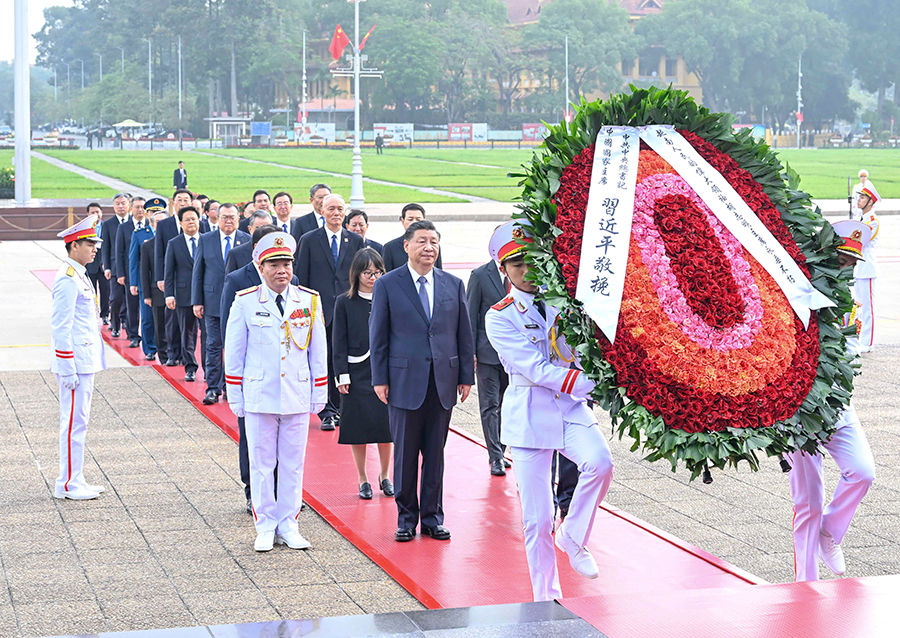 2023年,習(xí)近平總書記在訪越期間來到巴亭廣場,沿著載有無數(shù)歷史印記的石板路,前往胡志明陵敬獻花圈,追思緬懷。