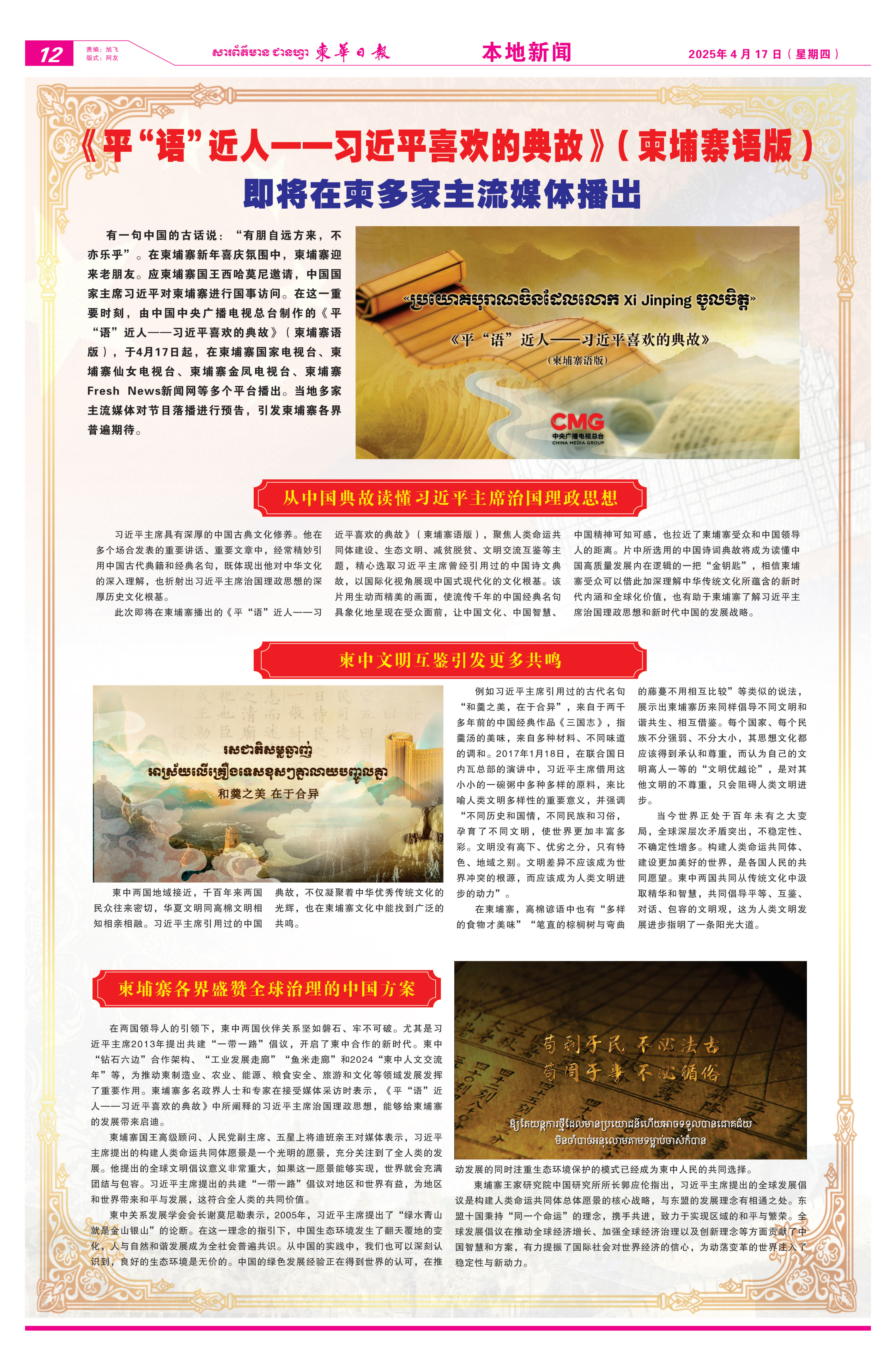 4月12日至17日,《柬華日報》《大都市報》等當(dāng)?shù)貓蠹埧l(fā)節(jié)目播出預(yù)告消息。文章指出,《平“語”近人——習(xí)近平喜歡的典故》(柬埔寨語版)是一把讀懂中國高質(zhì)量發(fā)展內(nèi)在邏輯的“金鑰匙”,相信柬埔寨受眾可以通過這些中國古籍和經(jīng)典名句加深理解中華優(yōu)秀傳統(tǒng)文化所蘊(yùn)含的新時代內(nèi)涵和全球化價值,了解習(xí)近平主席治國理政思想和新時代中國的發(fā)展戰(zhàn)略。
