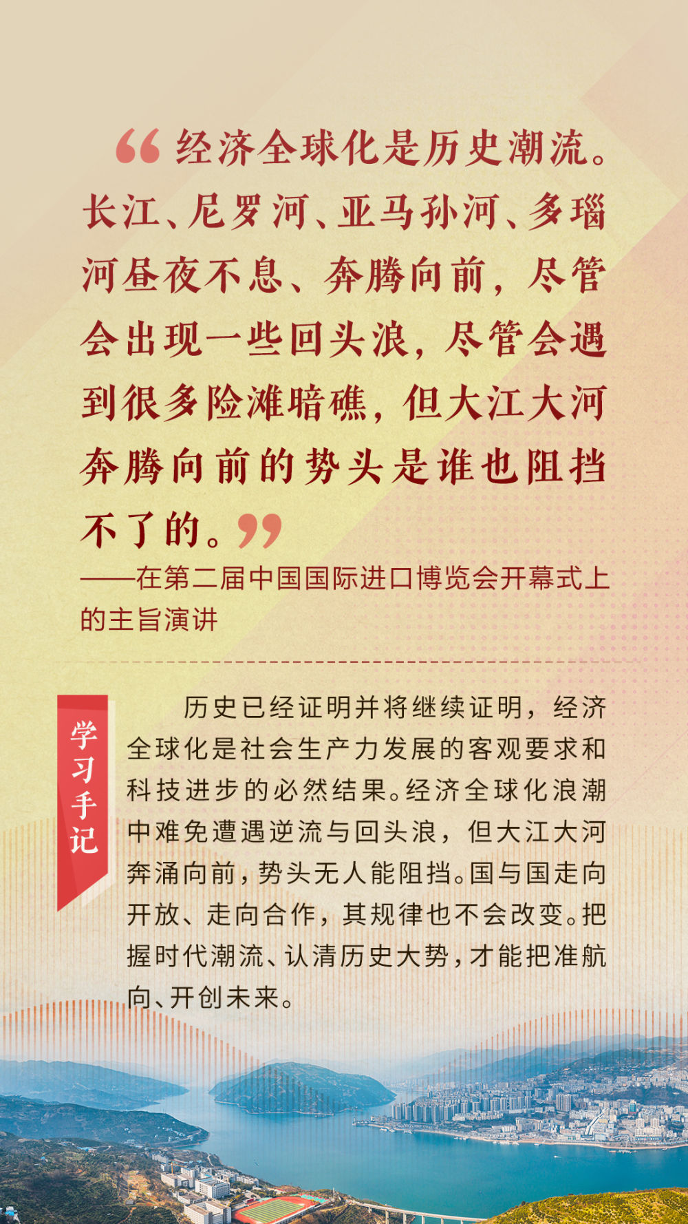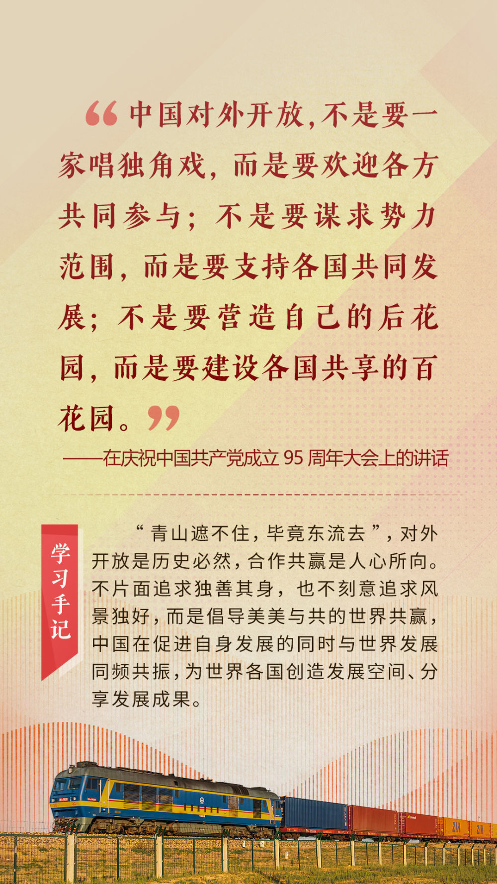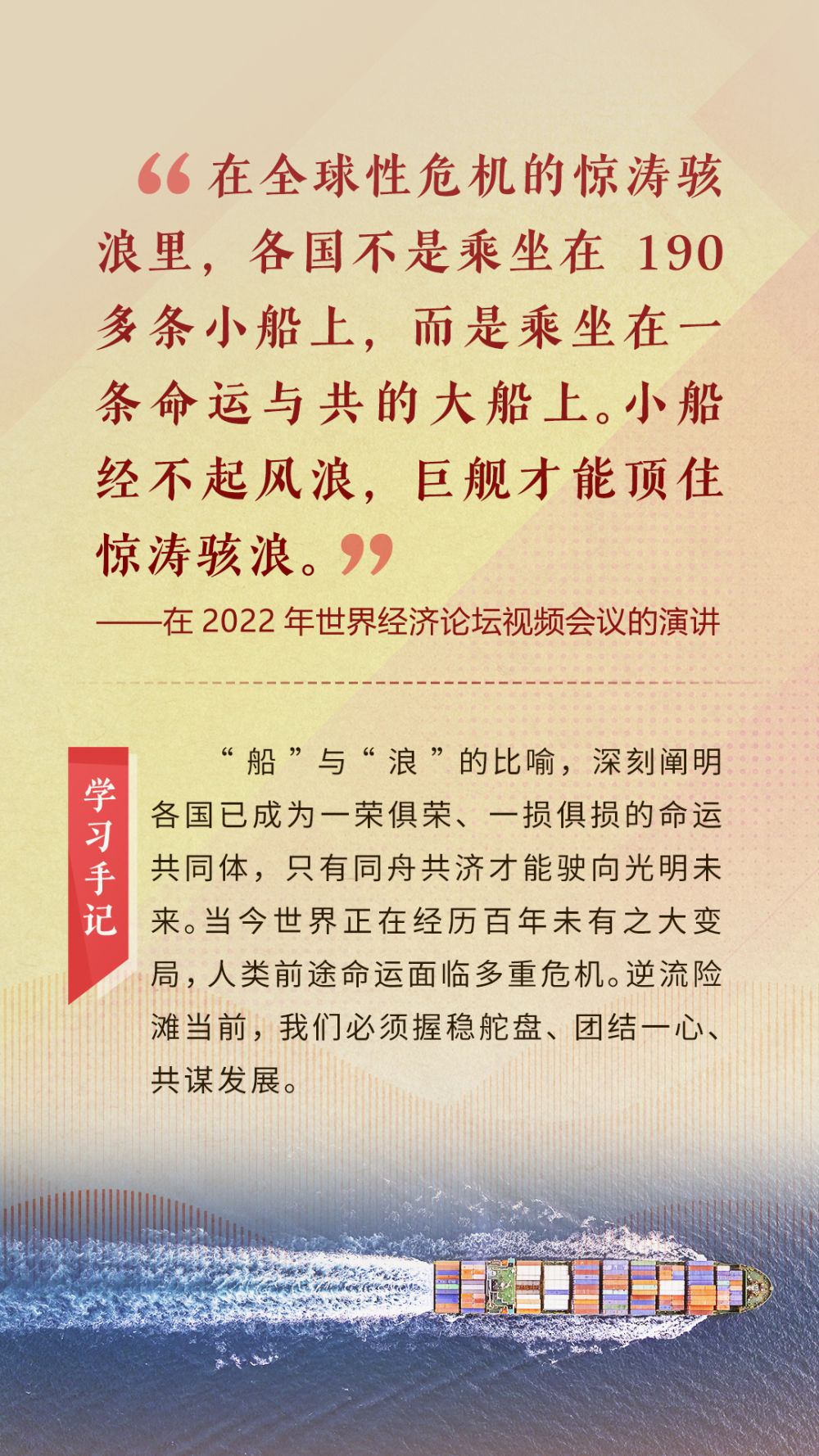 “天空足夠大,地球足夠大,世界也足夠大,容得下各國(guó)共同發(fā)展繁榮”“你中有我、我中有你的命運(yùn)共同體”“與中國(guó)同行就是與機(jī)遇同行”……習(xí)近平總書(shū)記一次次在重要場(chǎng)合發(fā)表重要講話,指引我們站在歷史正確的一邊,站在人類進(jìn)步的一邊,不畏浮云、登高望遠(yuǎn),不懼風(fēng)浪、勇毅前行。
