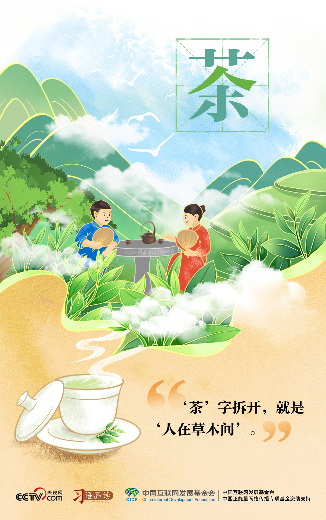 不同的交流場景,蘊藏著相通的茶文化。總書記先將“茶”字拆解為“人在草木間”,形象描繪種茶、采茶、制茶和飲茶過程中人與自然和諧共生的畫面。之后,總書記又以“因茶致富”“因茶興業(yè)”闡釋茶的經(jīng)濟價值和賦能千行百業(yè)發(fā)展的多元價值。