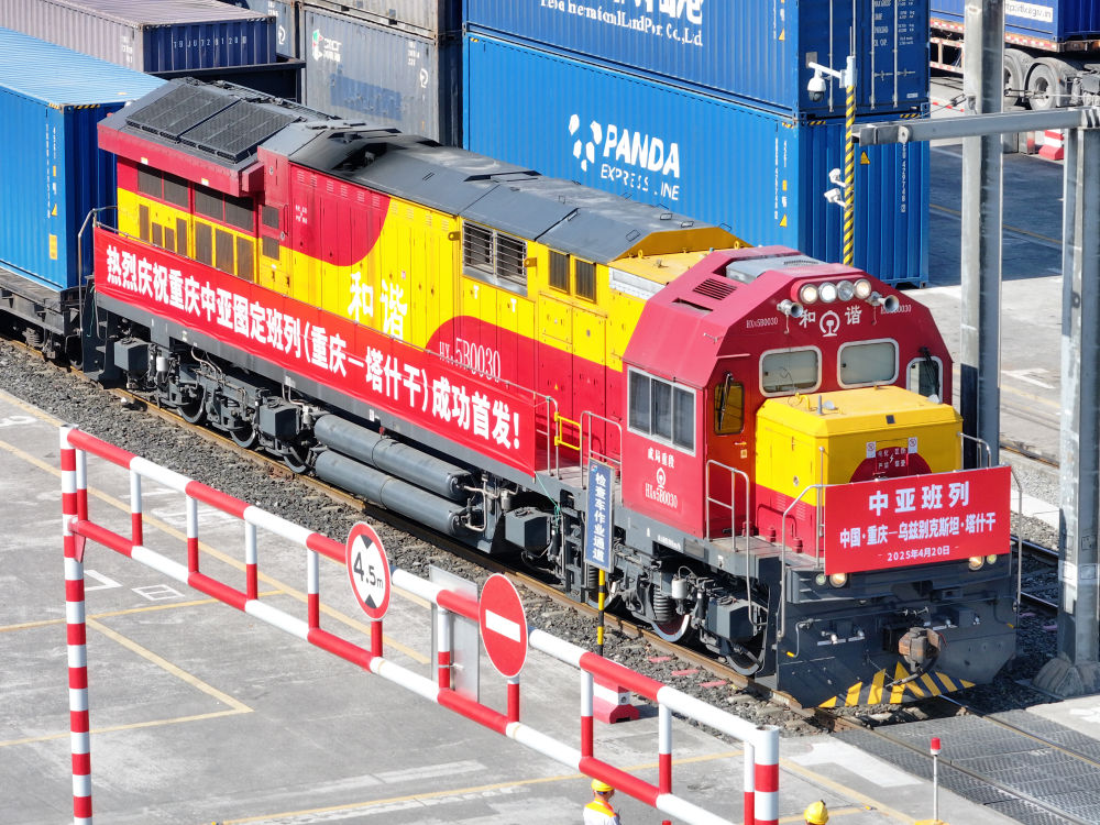 4月20日,圖定中亞班列在重慶團(tuán)結(jié)村中心站等候發(fā)車(無(wú)人機(jī)照片)。新華社記者 唐奕 攝