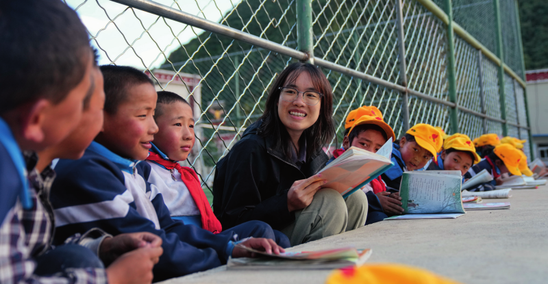 在西藏林芝市工布江達縣娘蒲鄉(xiāng)中心小學(xué),嶺南師范學(xué)院支教隊隊員涂建枝在晚自習(xí)前和孩子們一起溫習(xí)功課(2024年9月3日攝)劉洲鵬攝/本刊